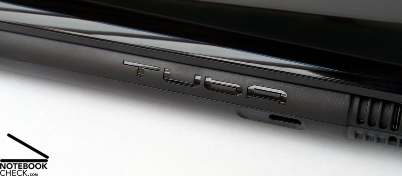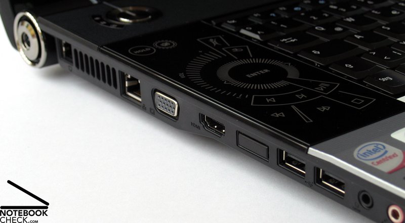 Der Öffnungsmechanismus des Displays schiebt den Bildschirm über die hintere Gehäusekante nach unten, was eine Positionierung von Anschlüssen an der Rückseite ausschließt. Auch an der Vorderkante wurde auf Anschlussoptionen verzichtet. Lediglich der 6in1 Cardreader (SD, MMC, MMCplus, MS, MS PRO, xD) findet an der schmal zulaufenden Kante Platz.