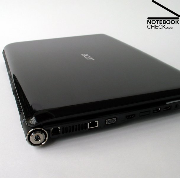 Die linke Gehäuseseite nimmt im Bereich des Scharniers den Netzanschluss auf. Davor kommen der Modem- und LAN Anschluss zu liegen. In weiterer Folge findet man noch einen analogen VGA Ausgang sowie einen modernen volldigitalen HDMI Port. Es folgen zwei weitere USB 2.0 Anschlüsse und die Audio Ports (Kopfhörer, Mikrofon, Line-In). Acer verweist außerdem auf eine S/PDIF Schnittstelle (optisch) mit 5.1 Surround Output.