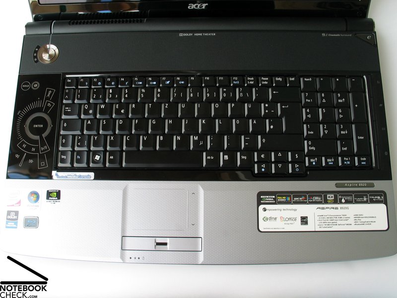 Die aufgrund des Displayformates zur Verfügung stehende Gehäusebreite nutzt das Aspire 8920G einerseits durch einen Nummernblock rechts neben der Standardtastatur und andererseits durch die CineDash Media Console auf der gegenüber liegenden Seitenkante. Bei einer Gehäusebreite von stolzen 44 Zentimetern bleibt dabei sogar noch etwas Platz um rechts neben der Tastatur einige Zusatztasten zur Steuerung von Bluetooth und WLan als auch Schnelltasten zum Öffnen des Standard Mail Programms und Internet Browsers zu platzieren.