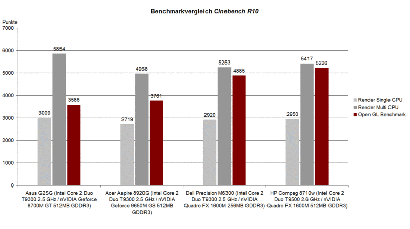 Die erreichten 6068 Punkte im PCMark 2005 Benchmarktest attestieren dem Aspire 8920G eine sehr gute Office Performance. Durchschnittlich fiel das Ergebnis im Cinebench R10 Benchmarktest aus. Interessanterweise konnte trotz identer CPU, im Rendering Test nur ein deutlich schlechteres Ergebnis als das Asus G2SG eingefahren werden. Im Shading Test (OpenGL) liegt das Acer mit der Geforce 9650M GS Grafik aber deutlich voran.