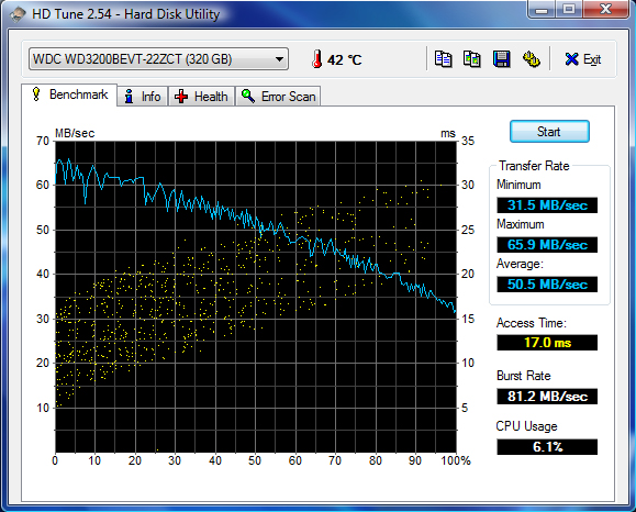 Ähnliches gilt auch für die beiden verbauten Festplatten von Western Digital, die mit je 320GB Speicherkapazität insgesamt 640GB Bruttokapazität bieten, wovon allerdings ein nicht unwesentlicher Teil durch das Betriebsystem, diverse vorinstallierte Software und de Recovery Daten belegt wird. Bei einer Geschwindigkeit von 5400 U/min zeigten die verbauten Festplatten im HDTune Performance Test eine sehenswerte Performance hinsichtlich Übertragungsraten und Zugriffszeit.