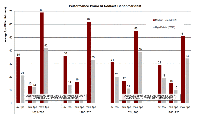 Im ersten Test anhand des Echtzeit Strategie Games World in Conflict kann man bei einer Auflösung von 1024x768 und Medium Details, bei der durchschnittlichen Framerate einen leichten Vorteil (+4 fps) für die neue Geforce 9650M GS Grafik erkennen. Bei High Details (DirectX10) schrumpft der Vorsprung auf marginale und eher vernachlässigbare 1 fps zusammen. Ein sehr ähnliches Bild erhält man bei einer Erhöhung der Auflösung auf 1280x720 Pixel. Interessant ist hier jedoch, dass auf High Details vom Asus G2SG in dieser Auflösung ein etwas besseres Ergebnis (+5 fps bei der durchschnittlichen Framerate) geliefert wird, während bei Medium Details doch das Acer mit 9650M GS Grafik die Nase voran hat (+7 fps).