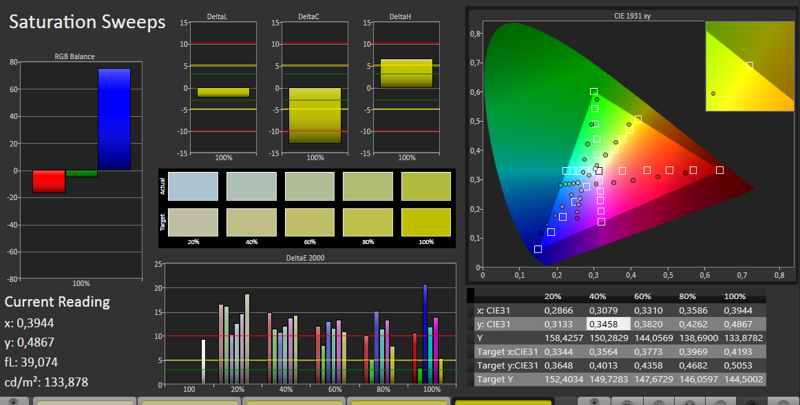 | Display P3 Coverage (%) | 44.03 | 42.65 -3% | 40.11 -9% | 43.04 -2% | 40.19 -9% | 40.19 -9% | |