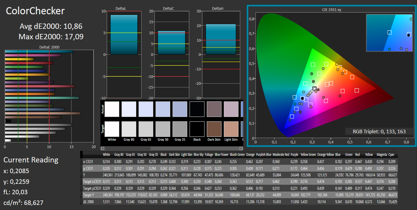 | Delta E Graustufen * | 10.5 | 12.12 -15% | 11.81 -12% | 10.74 -2% | 13.57 -29% |