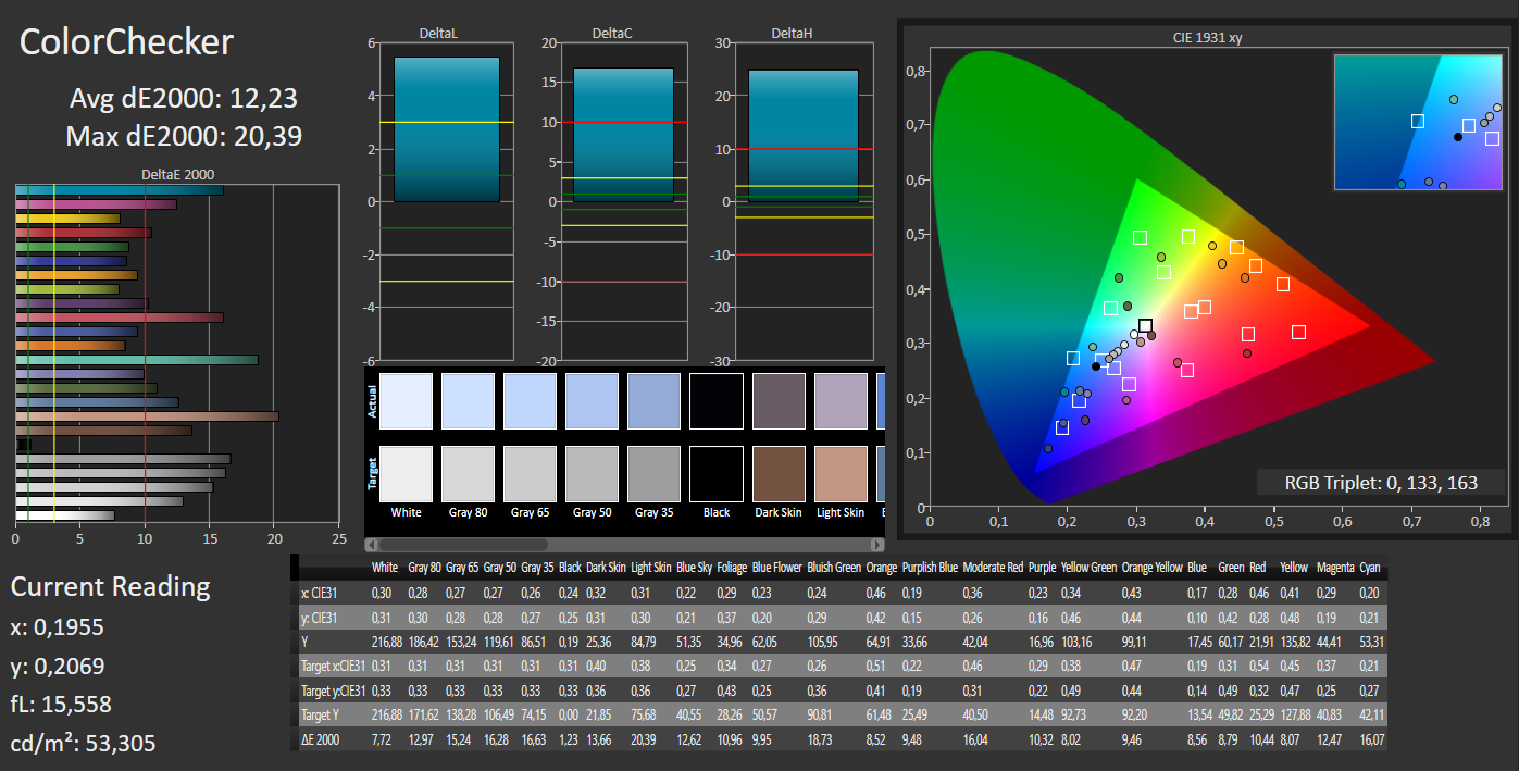 | Colorchecker dE 2000 max. * | 20.4 | 13.74 33% | 16.46 19% | ||