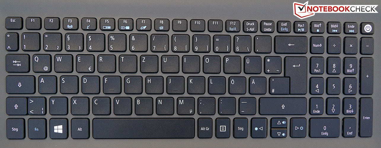 Auch hier hat sich im Vergleich zu ähnlich großformatigen Serienvertretern wie dem Aspire ES1-731 nichts getan – und das ist durchaus positiv zu sehen. Denn bei der Standardtastatur für die günstigen 17-Zöller handelt es sich um ein gelungenes Chiclet-Modell, das einen klaren Druckpunkt sowie einen angenehmen Tastenhub besitzt. Das Keyboard gibt unter Druck kaum nach und ermöglicht damit ein zügiges, angenehmes Schreiben auch über einen längeren Zeitraum hinweg.