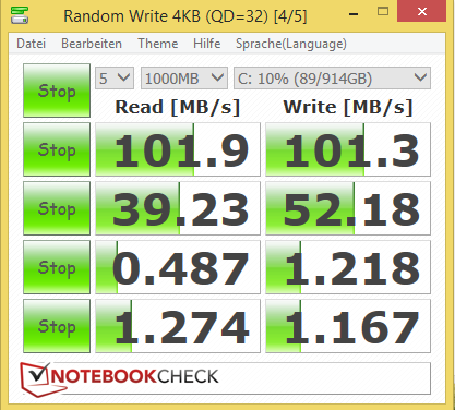 Für die Speicherung aller Daten wird eine Western Digital mit 1 TB Speicher und 5.400 RPM verbaut. Die Vergleichsmodelle sind gleicherweise mit Magnetfestplatten versehen und liegen in der Auswertung des CrystalDiskMarks 3.0 hinter den Lese- und Schreibergebnissen des Acers. Verglichen mit allen Festplatten, welche wir in den letzten 12 Monaten getestet haben, liegt die WD genau im Durchschnitt.