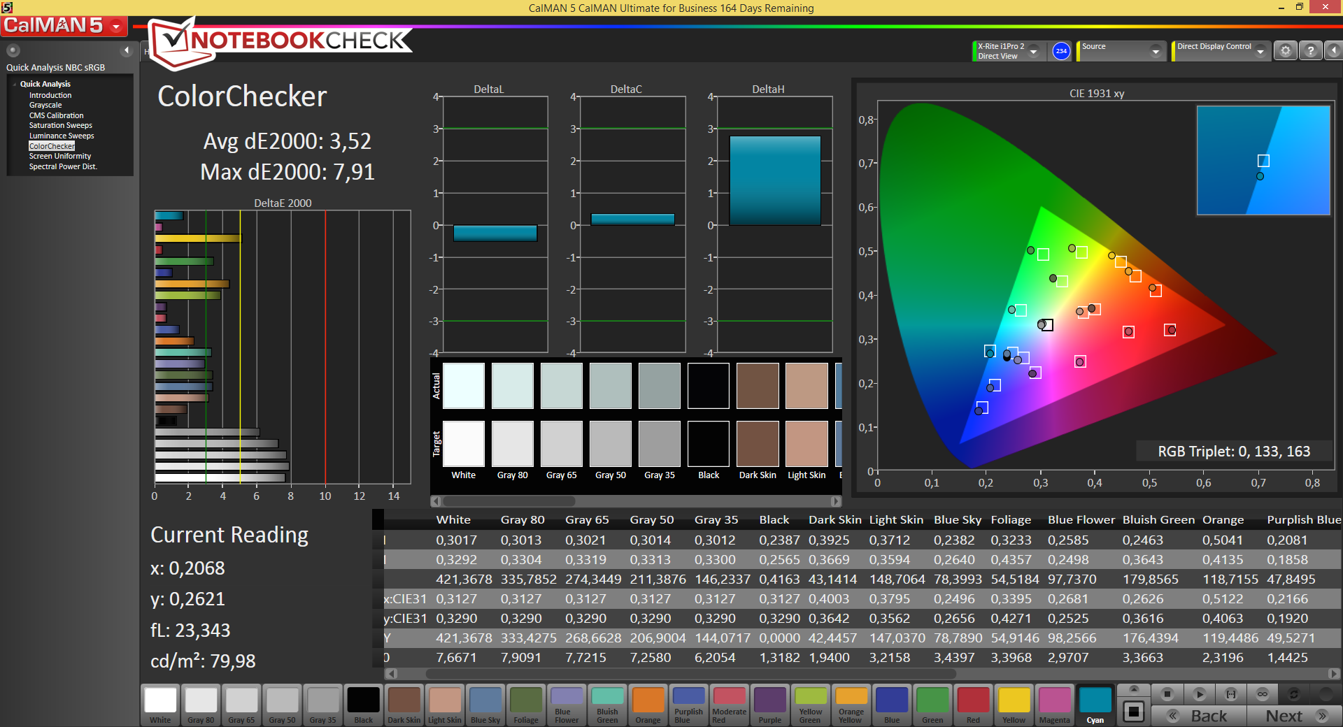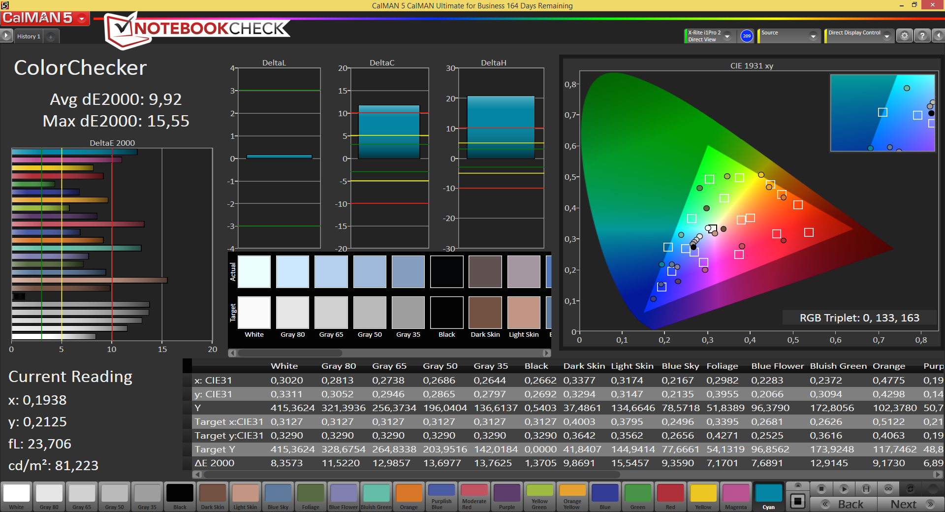 Dank der exzellenten Ausleuchtung des Acers ist der Außeneinsatz jederzeit möglich, zumindest wenn man ein 17-Zoll-Notebook im Outdoorbereich einsetzen will. Widmen wir uns an dieser Stelle der Calman-Analyse, erkennen wir mit einer DeltaE-Abweichung der Graustufen von 11,1 einen deutlichen Blaustich, der nach Kalibrierung glücklicherweise weitestgehend verschwindet. Bei den Farben liegt die dE2000-Abweichung ebenfalls mit 9,92 ziemlich hoch.