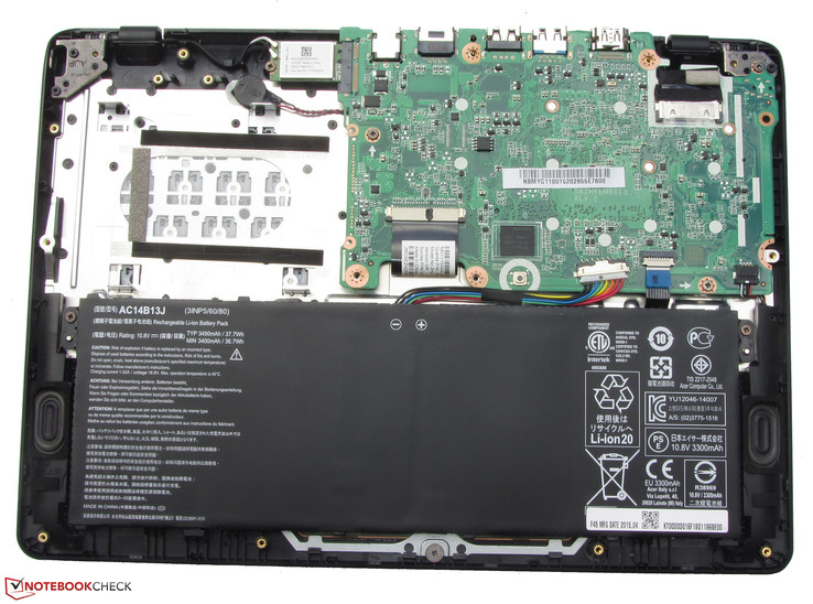 Eine Öffnung des Gehäuses ist problemlos möglich. Nach Entfernung aller Schrauben auf der Unterseite kann die Unterschale leicht abgelöst werden. Allerdings kann der Nutzer hier relativ wenig bewegen. Arbeitsspeicher und Systemspeicher sind fest auf der Platine verlötet. In dem Gehäuse ist Platz für eine 2,5-Zoll-Festplatte reserviert. Unser Testgerät kann aber nicht mit einer Festplatte bestückt werden, da der entsprechende Anschluss fehlt. 2,5-Zoll-Festplatten sind anderen Varianten des Aspire vorbehalten.