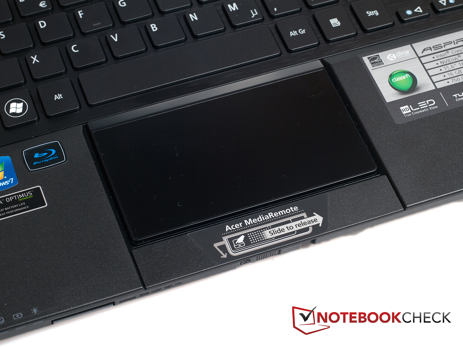 Das Touchpad weckte bei uns gemischte Gefühle. Für die Einen ist es praktisch, das Touchpad zusätzlich als Fernbedienung nutzen zu können, während Andere es einfach nur nervig finden und das Touchpad als Fremdkörper im Notebook ansehen. Mit seiner Diagonalen von 125 Millimetern (Breite 108 Millimeter, Höhe 58 Millimeter) ist die nutzbare Fläche erfreulich groß ausgefallen. Die Trennung zwischen Touchpad und Handballenauflage ist ebenfalls gewährleistet, hier klaffen zwei große Spalten von zirka 4 Millimetern. Die Oberfläche des Touchpads ist sehr glatt und jede Berührung hinterlässt sofort Fingerabdrücke und Schlieren. Schade dass die einzige Fläche des Notebooks die wirklich anfällig für Fingerabdrücke ist, gerade das Touchpad ist. In der Praxis muss man sich zunächst an die glatte Oberfläche gewöhnen. Ist dies einmal geschehen, kann man gut mit dem Touchpad arbeiten. Multitouch ist ebenfalls vorhanden und profitiert von der großen Fläche des Touchpads.