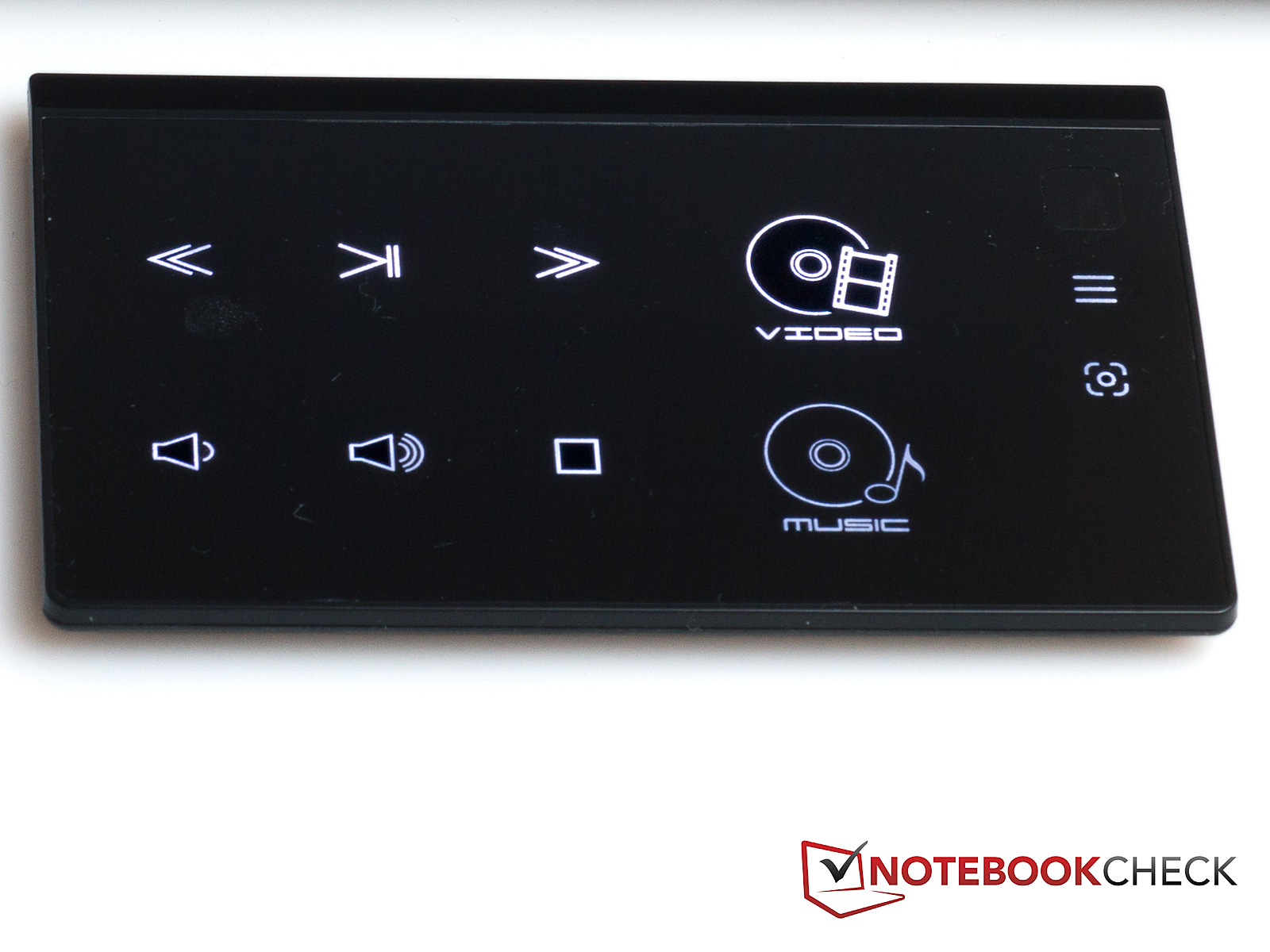 Löst man das Touchpad mit Hilfe des Schiebereglers aus der Halterung, kann es nun seine zweite Aufgabe erfüllen. In der oberen rechten Ecke befindet sich ein kleiner Button, mit dem man Symbole auf das Touchpad schalten kann um so beispielsweise einen Videoplayer am Notebook zu steuern. Natürlich kann man es im ausgebauten Zustand auch weiterhin als Touchpad nutzen.
