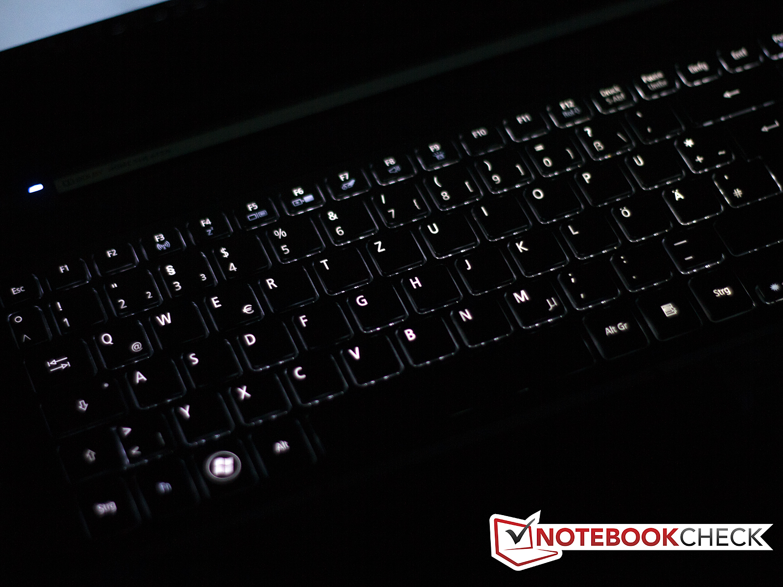 Bei der Tastatur handelt es sich um dieselbe, wie auch schon beim großen 18-Zoll Modell, dem Ethos 8951G, nur das hier deutlich weniger Platz an den beiden Seiten bleibt. Auch hier besteht die Tastatur aus einzelnen, freistehenden Tasten. Die Tasten messen 15 x 15 Millimeter und sind damit ausreichend groß ausgefallen. Auch die Tastenabstände sind mit rund 4 Millimetern ausreichend groß. Tastenhub und Druckpunkt sind sehr angenehm gewählt worden und ermöglichen ein bequemes und zugleich zügiges Schreiben. Eine Hintergrundbeleuchtung erhellt die Tastatur bei Nacht. Diese lässt sich nur Ein- und Ausschalten, heller oder dunkler schalten ist nicht möglich. Bis hin zum Nummernblock haben wir bisher nichts an der Tastatur auszusetzen. Nur innerhalb des Nummernblocks enttäuscht die Tastatur. Drückt man beispielsweise die Taste 5 (ohne viel Druck), kann man deutlich sehen, wie alle Tasten des Nummernblocks, bis hinauf zu den Sondertasten, nachgeben.