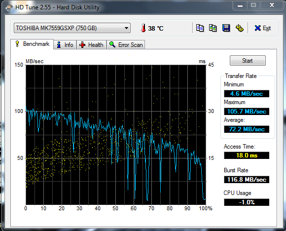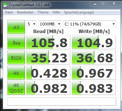 Acer verbaut im Aspire Ethos 5951G eine Festplatte von Toshiba, nämlich die MK7559GSXP. Bei der Toshiba Festplatte handelt es sich um ein 2.5 Zoll Modell mit einer (Brutto-) Kapazität von 750 GB. Die Magnetscheiben rotieren, wie bei den meisten Notebookfestplatten üblich, mit 5.400 U/min. Die Messergebnisse lassen die Festplatte im Durchschnitt verschwinden. Die Festplatte hebt sich nicht durch besonders gute Werte ab.