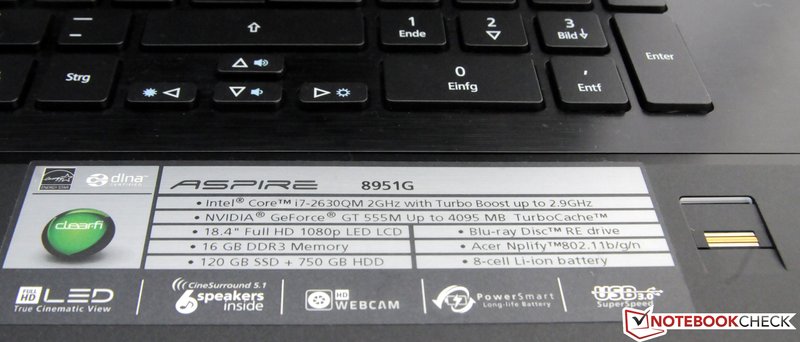Unser Testgerät mit der Bezeichnung 8951G-2631687Wnkk (LX.RJ202.059) hat einen Wert von rund 1699 Euro. Dafür bekommt der Käufer aber ein flottes Solid-State-Drive vom Typ Intel X25-M mit 120 GByte Speicherplatz und auch an Arbeitsspeicher steht einiges zur Verfügung, denn Acer stattet sein Aspire Ethos 8951G mit 16 GByte DDR3-Ram aus. Für den restlichen Speicherbedarf hat Acer noch eine weitere Festplatte mit 750-GByte (7200 Umdrehungen pro Minute) aus dem Hause Western Digital eingebaut. Ebenfalls wurde an Blu-ray gedacht. Hierfür stellt der Hersteller ein optisches Laufwerk von Matshita zur Verfügung. Das 18,4 Zoll große Full-HD-Display schafft maximal eine Auflösung von 1.920 x 1.080 Bildpunkten. Zu den Besonderheiten gehört die 5.1 Soundanlage, die ein tolles Klangerlebnis verspricht. Außerdem lässt sich das Touchpad entnehmen und als Fernbedienung nutzen. Weiterhin sind Features wie USB 3.0 oder ein Fingerabdruck-Leser eingebaut.