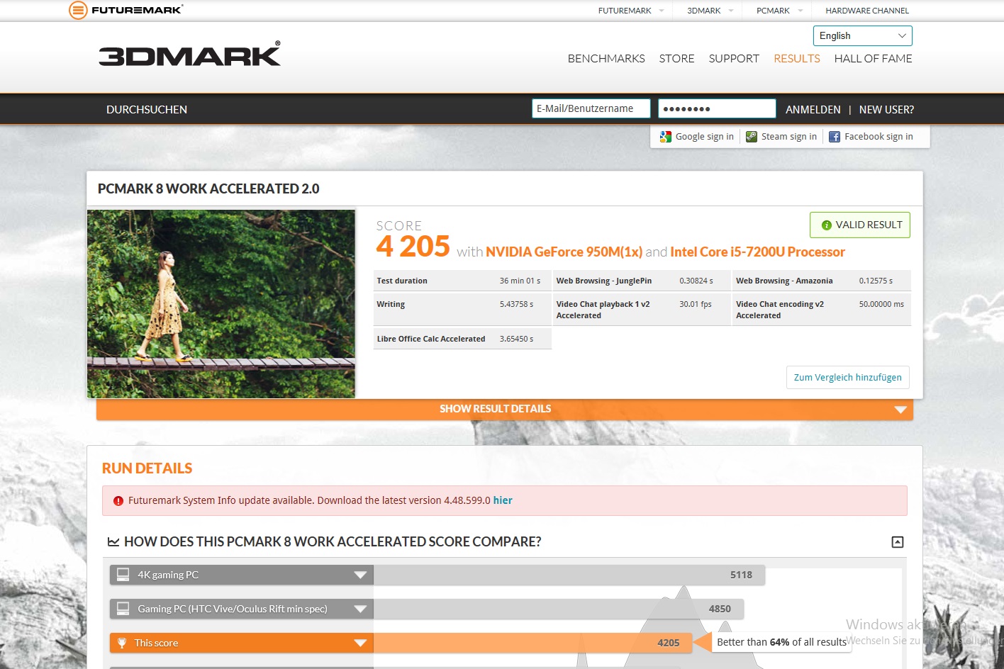 In unserem Praxistest wählen wir den Balance-Modus im Energiemenü, aktivieren WLAN, regulieren die Helligkeit auf ca. 150 cd/m2 und surfen im Netz. Nach etwa 4,5 Stunden geht dem Acer hier die Puste aus, und es muss wieder ans Netz. Das Aspire F5-573G hält hier 6,5 Stunden durch, das E5 nochmals eine Stunde länger. Natürlich muss man hier bedenken, dass es sich um 15-Zoll-Geräte handelt, die deutlich mobiler sein müssen als ein 17-Zoller. Letzterer wird wohl eher stationär als unterwegs benutzt. Das ebenfalls 17 Zoll große Medion bietet deshalb eine ähnliche Laufdauer, das Asus ist auf Grund des noch kleineren Akkus Letzter mit nur 3,6 Stunden.