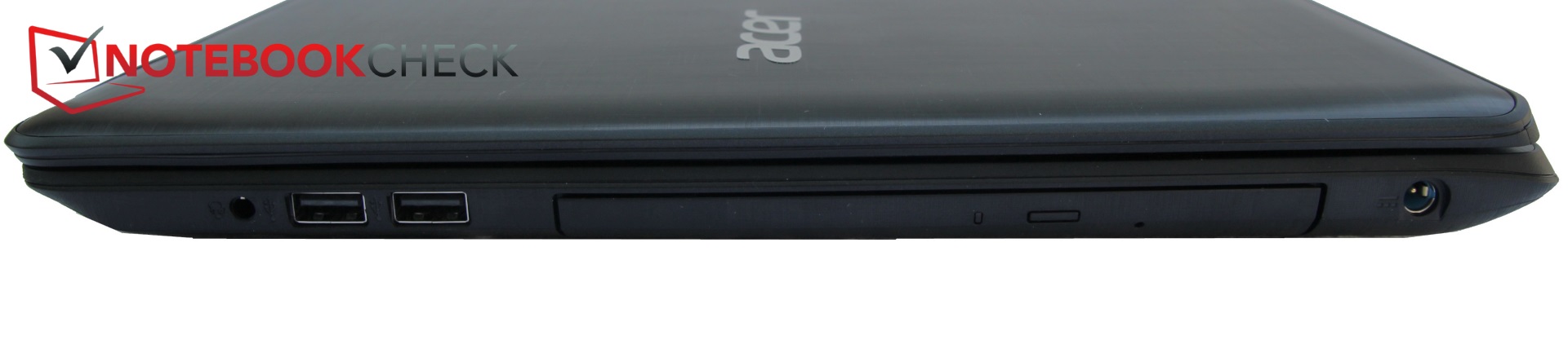 Acer verbaut vermutlich das gleiche Lautsprechermodell wie bei den beiden anderen Acer Notebooks im Vergleich. An der vorderen Unterseite befinden sich zwei kleine Öffnungen, die dahinter ebenso kleine, unscheinbare Lautsprecher vermuten lassen. Dem Klang fehlt es dementsprechend auch an Präsenz. Höhen und Mitten werden zwar relativ klar wiedergegeben, Bass-Tiefen kommen dafür so gut wie gar nicht rüber. Bei dem Rennspiel Dirt Rally klangen dann z. B. die Motorgeräusche wunderbar passend blechern und röhrig, aber selbst hier haben wir die Tiefen vermisst. Für eine anspruchvollere Musikwiedergabe sollte definitiv ein Headset verwendet oder eine externe Anlage angeschlossen werden. Zu diesem Zweck gibt es leider nur einen einzigen, kombinierten Audio-Ein-/Ausgang. Je nach Wahl kann man hier ein Mikrofon, Kopfhörer oder eben eine externe Anlage per typischer Mini-Klinke (3,5 mm) verbinden.