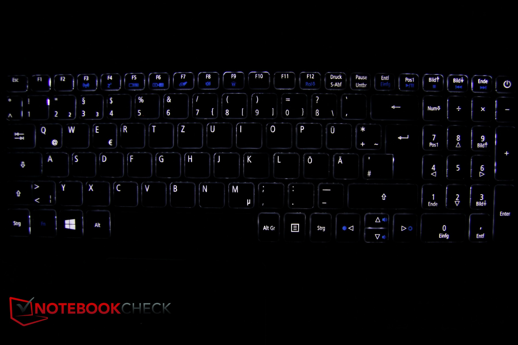 Durch die mit Alu verstärkte Unterplatte wirkt die Tastatur recht stabil, der Untergrund biegt sich nicht störend durch beim Tippen. Die Tastatur verfügt über eine optionale Beleuchtung, die zwar deaktiviert, jedoch nicht in der Helligkeit geregelt werden kann. Die Tastengröße ist mit 1,5 cm relativ klein ausgefallen, was uns angesichts des Platzes auf dem 17-Zöller überrascht. Hier könnten es Menschen mit großen und breiten Fingern etwas schwerer haben. Dafür gibt es kleine Abstände zwischen den Tasten. Trotzdem verschenkt man hier Platzpotential, denn die Oberfläche des 17 Zoll großen Notebooks bietet genug Fläche für größere Tasten oder gar zusätzliche Sondertasten. Die ungenutzte Rahmenbreite um die Tastatur herum ist schon beträchtlich.