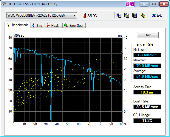 Die Western Digital Festplatte (Typ WD2500BEVT-22A23) mit 250 GByte erreicht im HD-Tune keinen hohen Datendurchsatz. 54.9 MB/s im Sequential-Read-Test sind bei 2.5-Zoll Notebook-Festplatten unterdurchschnittlich. Immerhin ist die HDD auch bei starker Aktivität des Lese- und Schreibkopfes fast unhörbar.