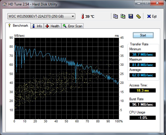 Die Western Digital Festplatte (Typ WD2500BEVT-22A23) mit 250 GByte bleibt HD-Tune ohne Auffälligkeiten. Zudem arbeitet die Festplatte angenehm leise.
