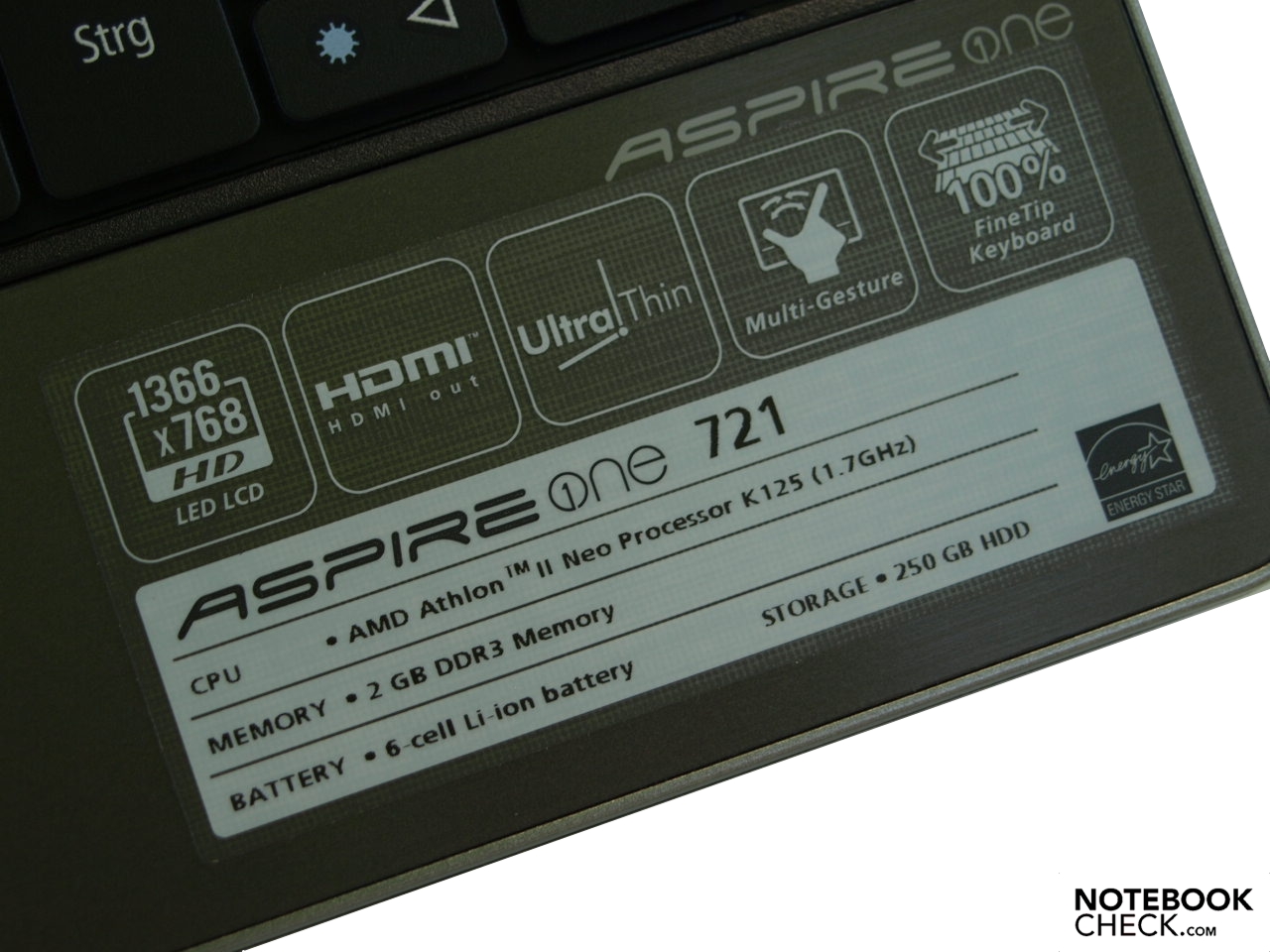 Der Einkern-Prozessor besitzt 1 MB L2 Cache und verbraucht höchstens 12 Watt (TDP). Der AMD Athlon II Neo K125 unterstützt den 64 Bit Betriebsmodus. Im Gegesatz zum Aspire One 521, wurde am Testgerät eine 64-Bit Version von Windows 7 Home Premium vorinstalliert.