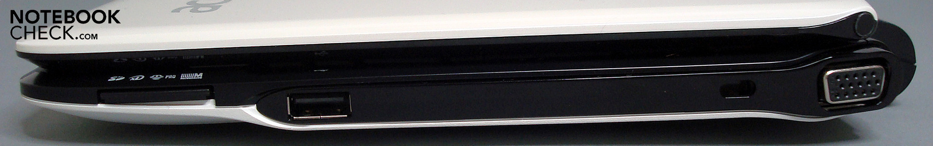 Deutlich besser als schon beim erwähnten kleinen Bruder Aspire One D250 präsentiert sich uns die Anschlußpositionierung. Zwar würden wir uns auch hier eine frontseitige und damit praxisgerechtere Platzierung der Audioanschlüsse wünschen, aber alleine die weit hinten und in ausreichendem Abstand (6mm) vorzufindenden USB-Anschlüsse auf der linken Seite entschädigen dafür. So kann neben einem überbreiten USB-Stick (UMTS, TV, Speicher) immer noch ein normalbreites USB-Kabel (Festplatten, Drucker, Verlängerungen) in der Nachbarbuchse verwendet werden. Gut gefällt zudem der weit nach hinten gewanderte VGA-Port der bei einer Anbindung eines externen Bildschirms geringstmögliche Einschränkungen durch die Kabelverbindung hervorruft. Warum man auf der rechten Seite trotz üppiger Platzverhältnisse den USB-Anschluß weit vorne direkt neben dem Cardreader eingesetzt hat ist nicht ganz nachvollziehbar. Bei angeschlossenem USB-Gerät und gleichzeitiger Mausnutzung kann es da schnell zu Kollisionen kommen. Gut dass man auf der linken Seite eine praxisnahe Ausweichmöglichkeit hat.