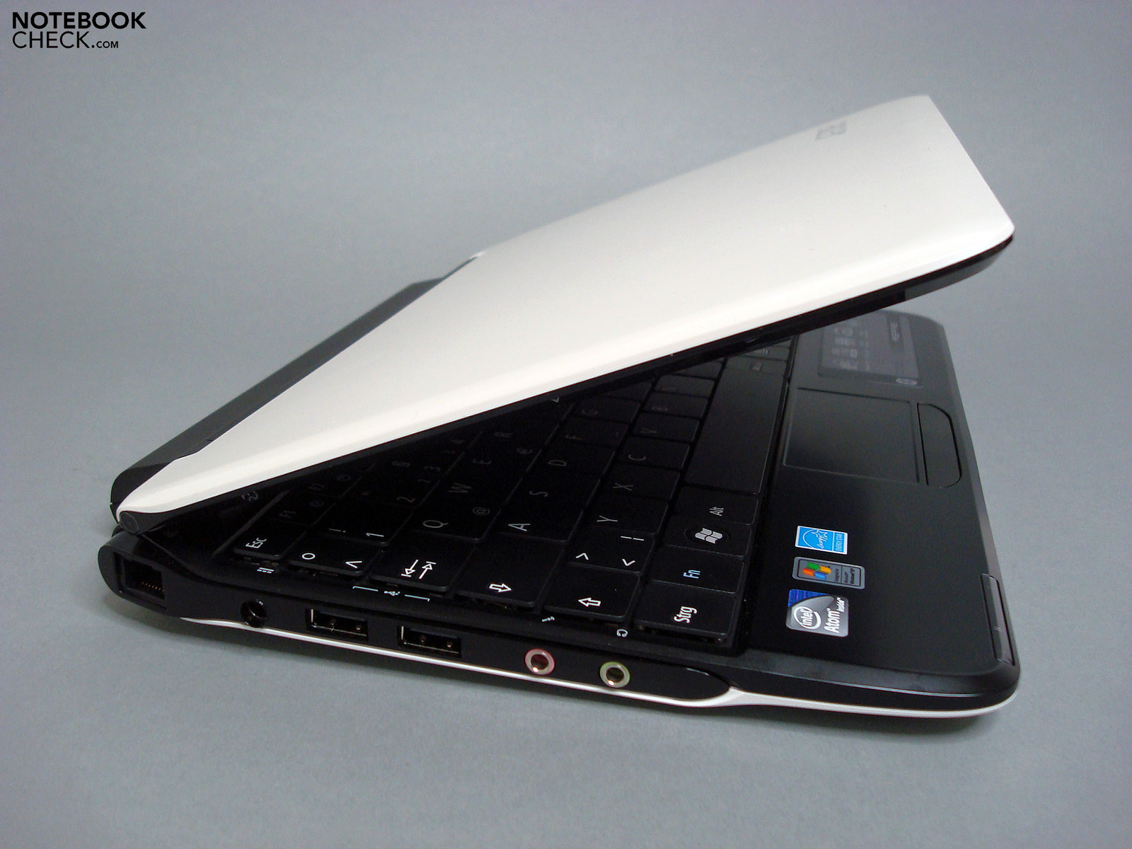 Das uns vorliegende Testmodell zeigt sich äußerlich in einem pflegeleichten „muschelweiß“ und im Arbeitsbereich in einem seidenmatten Schwarz. Der Displayrahmen ist glänzend lackiert, irritiert aber wegen der verhältnismäßig geringen Ausmaße und der abgeschrägten Seitenteile weniger als bei so manchem Konkurrenten. Die weiße Oberfläche ist wie auch schon beim Lenovo Ideapad S10e und Asus Eee PC 1000HE im Gegensatz zu dunkleren Lackierungen recht anspruchslos und kaschiert Staub und Fingerabdrücke verhältnismäßig gut. So bleibt das gutaussehende Book lange ansehnlich und erfordert nur ein gelegentliches Reinigen und Polieren.