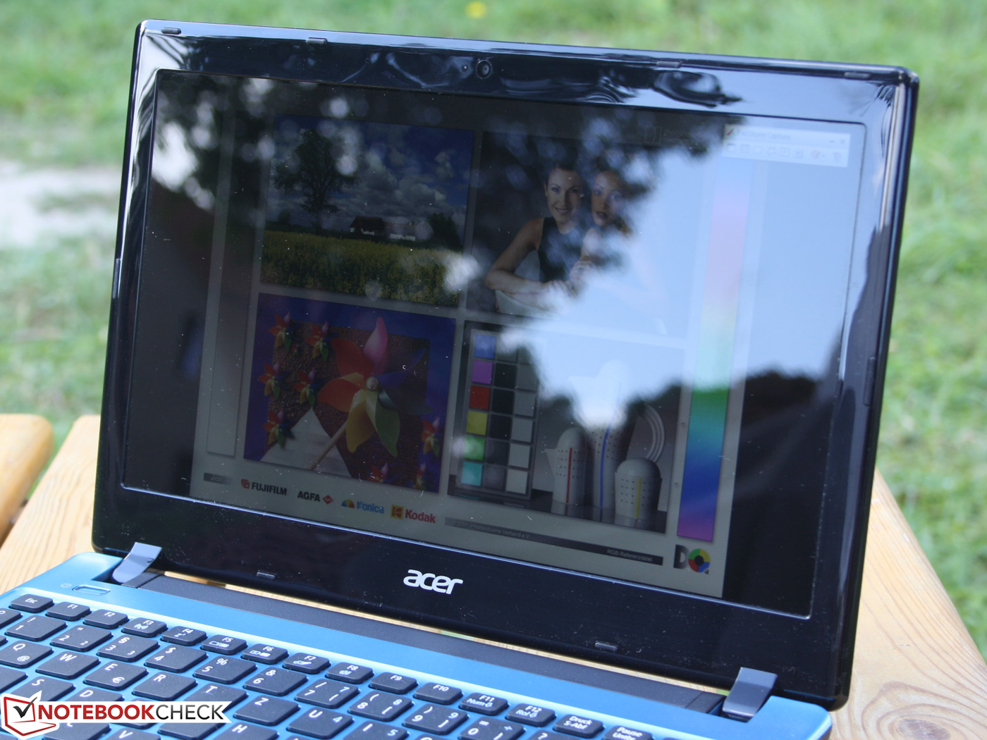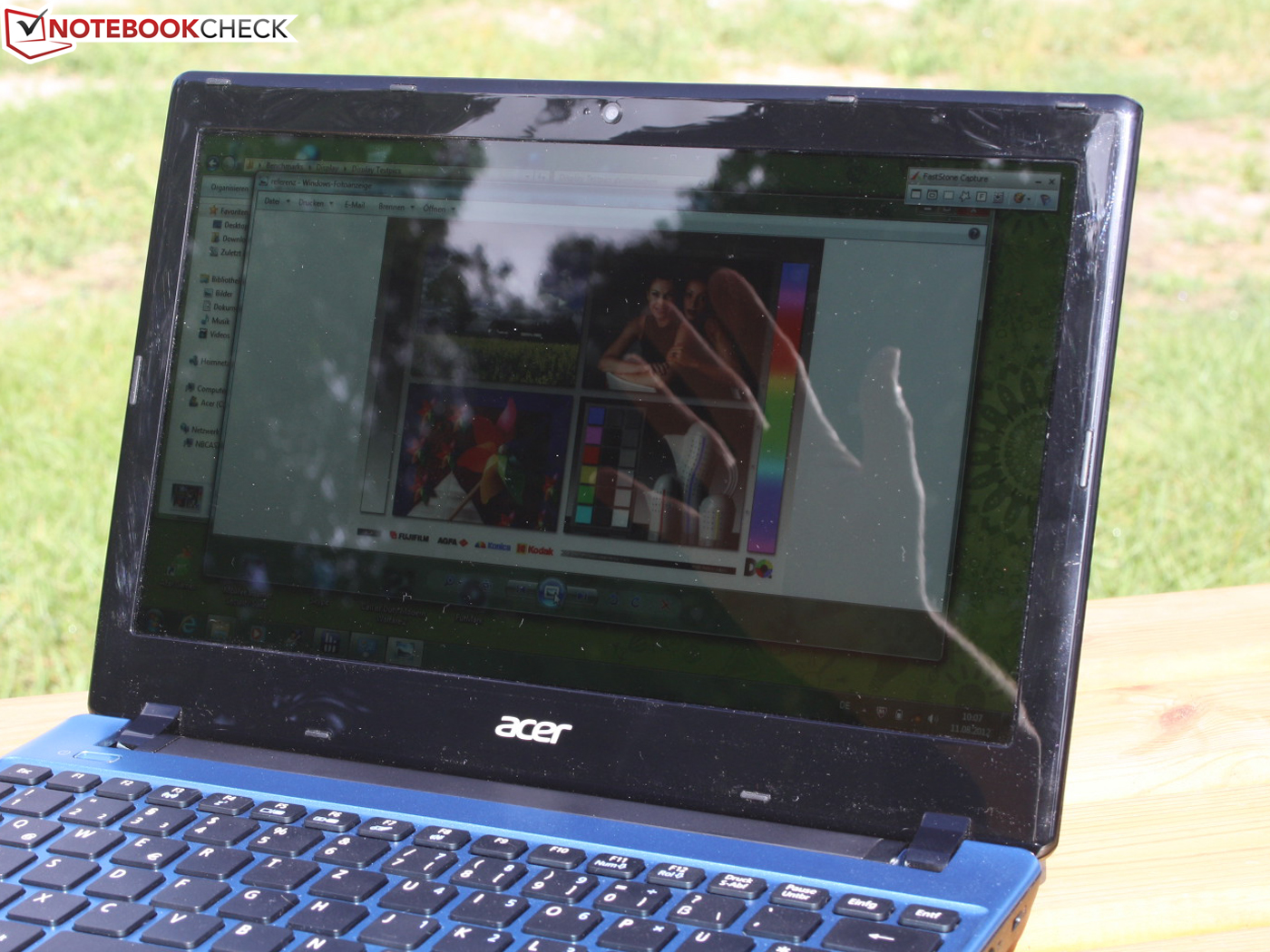 Die Helligkeit der Displayanzeige ist mit 217 cd/m² für Innenräume passabel, genügt aber nicht, um der Spiegelung im Tageslicht wirksam entgegen zu treten. Selbst bei einem matten Panel wären für den Outdoor-Einsatz idealerweise mindestens 250 cd/m² nötig, um den Desktop augenfreundlich ablesen zu können. So aber werden wir beim gemütlichen E-Mail-Check bei Kaffee und Kuchen von Reflexionen gestört. Der Desktop hüllt sich unter dem hellen Tageslicht in Dunkelheit, was das Lesen zur Quälerei werden lässt.
