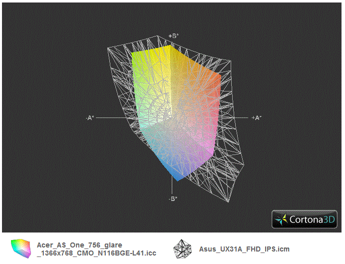 Der Farbraum, den wir mit AdobeRGB, sRGB und dem Premium-Panel des Asus UX31A FHD IPS (13,3-Zoll) vergleichen, ist sehr klein. Die Konkurrenz für weit unter 1.000 Euro hat allerdings auch nichts Besseres zu bieten, ganz gleich, ob es sich um Subnotebooks oder Laptops handelt. Der Farbraum spielt jedoch nur für die professionelle Bildbearbeitung eine Rolle. Diese Zielgruppe wird sich aber nicht mit einem leistungsschwachen 11,6-Zoller abgeben, sondern gleich zu einer Workstation greifen.