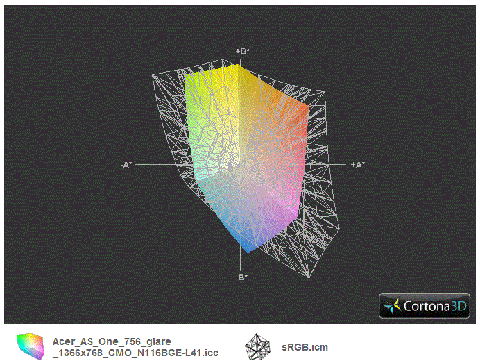 Die 11,6-Zoll (29.46 cm) Anzeige vom taiwanesischen Panelhersteller CMO (Typ N116BGE-L41) löst in 1.366 x 768 Bildpunkten auf. Diese HD-Auflösung hat sich seit vielen Jahren als Standard für den Formfaktor etabliert, es gibt keine Alternativen mehr. Das Panel mit dem 16:9 Seitenverhältnis wurde nicht entspiegelt. Die Glare-Type-Strategie gibt Acer nicht auf (siehe auch One 722/725), obwohl die meisten Konkurrenz-Angebote inzwischen wieder mit matten Anzeigen aufwarten (Lenovo ThinkPad Edge E130/E135, Samsung 305U1A, ASUS Zenbook Prime UX21A-K1010V aber auch TravelMate B113-M). Immerhin sorgt Acer CineCrystal für optisch kontrastärkere Farben. Der gemessene Kontrast lässt sich aber nicht täuschen und liegt nur bei 208:1, was in der Preisklasse aber nicht anders zu erwarten ist.