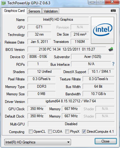 Nicht deaktiviert ist die integrierte Grafikkarte mit dem Namen HD Graphics 2000 bzw. einfach HD Graphics. Hier finden wir den einzigen Turbo, nämlich 350 bis 1.000 MHz bei GPU-Beanspruchung. Auch der DDR3-1333 Dual Channel Speicherkontroller ist, wie bei Sandy Bridge üblich, im Prozessor integriert.