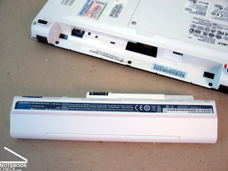 Der optisch überaus groß ausgefallene 6-Zellen Akku verweist auch hinsichtlich seiner technischen Daten auf eine ansprechende Leistungsfähigkeit. Mit einer Kapazität von 59 Wh die einem Stromverbrauch von nur rund 10 Watt im Idle Betrieb entgegenstehen, lässt die mobile Energiequelle auf eine großzügige Mobilität des Acer Aspire One D150 hoffen.