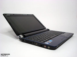 Die im Vergleich zum Aspire One D150 leicht geänderte Anschlußpositionierung bleibt ohne Effekt, da keine signifikante Verbesserung hinsichtlich der Handhabung erreicht wird. Der Cardreader wechselt die Seite, der VGA Port wandert etwas weiter nach vorne, aber die häufig genutzten USB und Audio-Anschlüsse befinden sich in unverändert unvorteilhafter Lage.