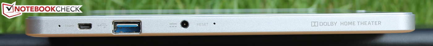USB-3.0- und ein Micro-HDMI-Anschluss befinden sich links oben am Gerät. Wer hier per Adapter ein externes TFT anschließt, der hat nicht nur klobige Kabel vor Augen (Schreibtisch Szenario). Schwere Stecker und Adapter ziehen auch bedrohlich an der kleinen Steckverbindung, welche nach gewisser Zeit brechen könnte. Wo das W700 noch einen Rotation-Lock-Schalter besaß (Oberseite links, bei Luftauslässen), bietet das P3 nichts dergleichen an.