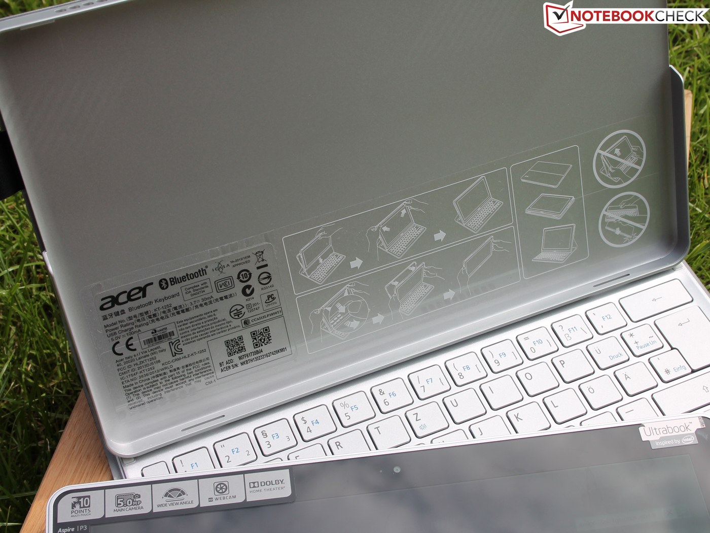 Acer liefert das P3 grundsätzlich mit dem Tastatur-Sleeve aus. Letzteres wird über den USB-3.0-Port des P3 geladen und per Schalter an- und ausgeschalten. Leider besitzt das Gerät nur einen USB-Steckplatz, weshalb die Verbindung während des Ladens schon belegt ist. Laden war während unserer Testphase aber kein zweites Mal nötig. Ein Adapter Micro-HDMI auf Standard-HDMI liegt nicht im Karton. Nur das USB-Ladekabel für die Tastatur wird mitgeliefert. Auf Grund eines speziellen, besonders flachen USB-Steckers für die Tastatur-Seite, braucht der Nutzer auch genau dieses Kabel und kein anderes.