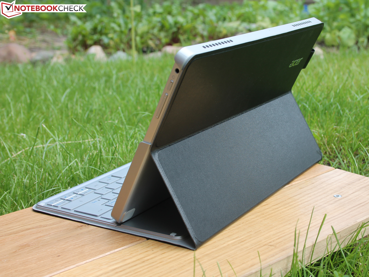 Die Laptop-Position arretiert sicher, denn über der Tastatur rastet ein Keil in eine schmale Aussparung ein. Andere Stelloptionen sind nicht möglich. Kopfüber passt sich zwar die Anzeige der Position an (Lagesensor), jedoch kippt das Tablet um.