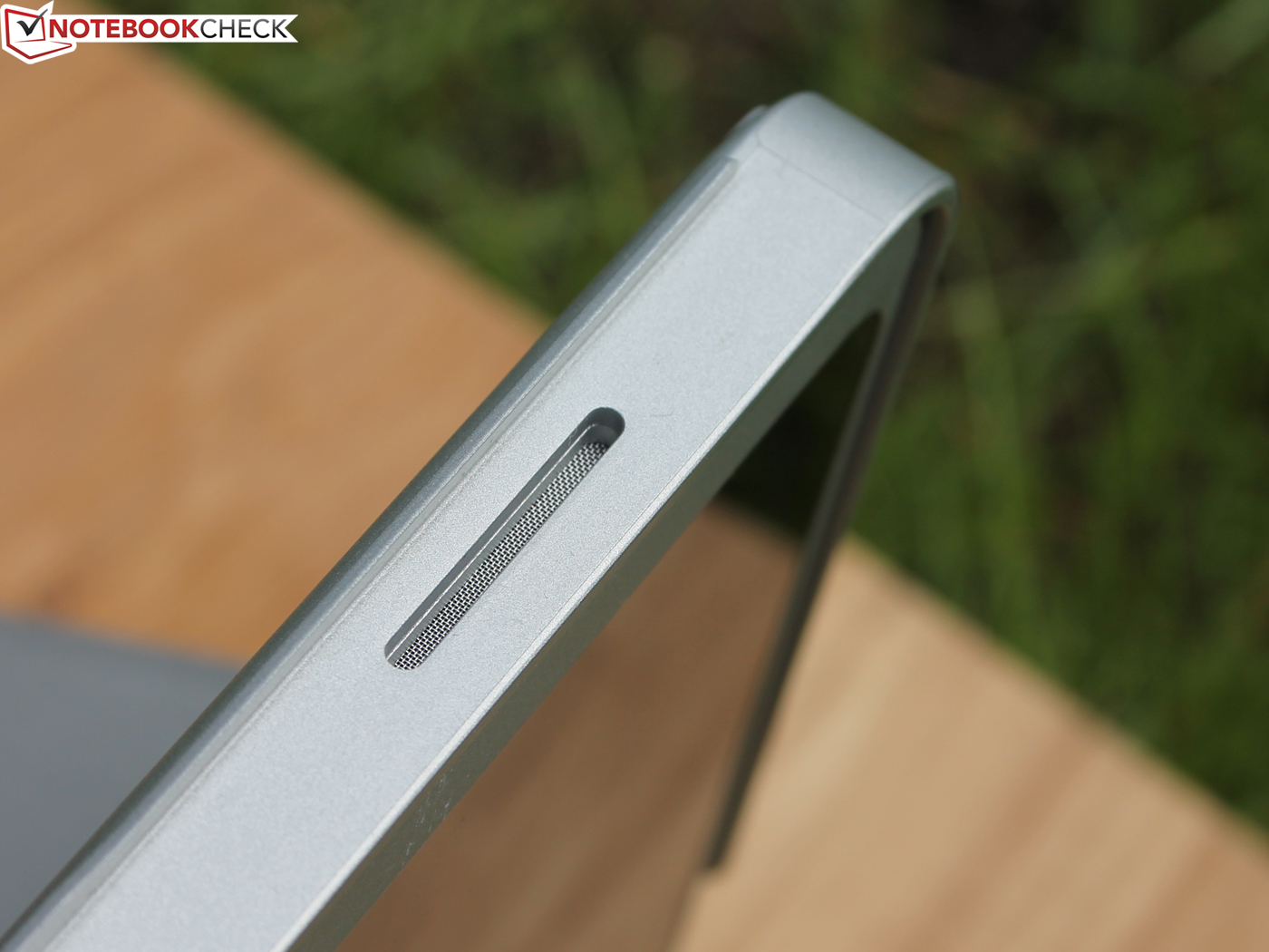 Weil die starke Helligkeit auch im Akkubetrieb nicht gedrosselt wird, erleben wir draußen ein angemessenes Bild vom Desktop. Durch starke Spiegelungen sehen wir uns aber oft mit Blickwinkeln kämpfen, denn Hintergründe reflektieren sehr stark. Für die Messung der maximalen Helligkeit haben wir den Ambient Light Sensor (Umgebungslichtsensor) mit einer Lampe belichtet. Dieser Sensor sorgt für eine adaptive Anpassung der TFT-Helligkeit an die Umgebung. Unter grellem Sonnenlicht regelt das Panel daher auf volle Leuchtkraft.