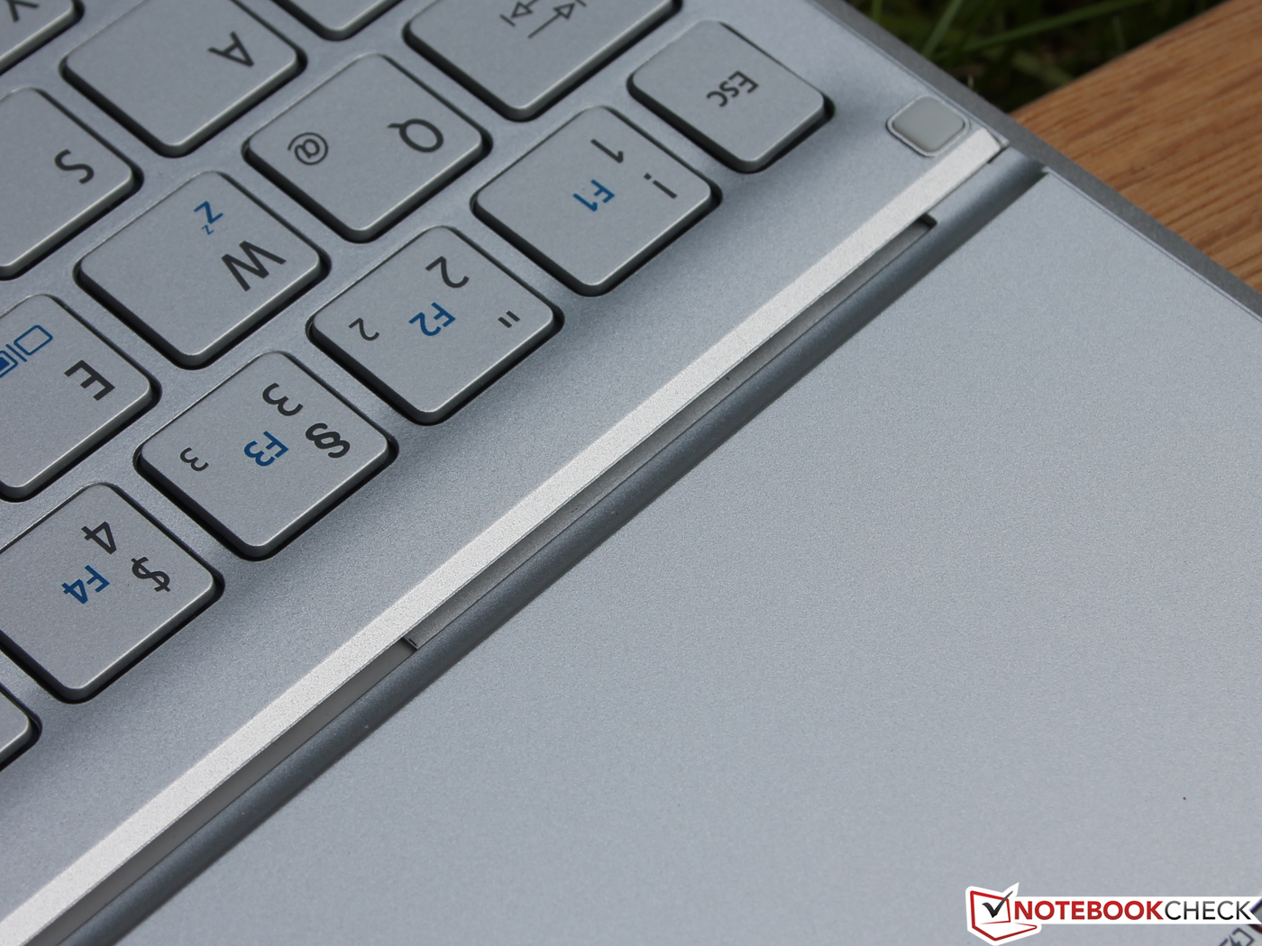 Die Tasten haben einen festen Anschlag und drücken nicht ein. Wenn das Gerät auf dem Schoß steht, wobei Freiraum unter der Tastatur ist, drückt die Fläche nur bei hohem Druck ein. Das Layout mit den großen Tasten, dem breiten Enter und dem Entfernen neben den Pfeiltasten empfinden wir als angenehm. Funktionstasten sind, wie bei Acer-Geräten üblich, mit Blau markiert.