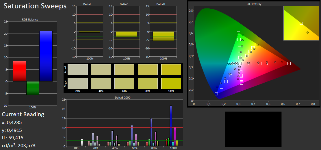 Wir haben vor der Kalibrierung eine Farbanalyse mit dem i1 Pro 2 Fotospektrometer und der CalMAN 5 Software ausgeführt. Diese zeigt gute Qualitäten bei der Darstellung von Grautönen. Speziell die mittleren Töne liegen deutlich unter einem DeltaE (2000) von 3. Die Anzeige hat also keinen Blaustich, wie so viele Laptops dieser und höherer Preisklassen. Der Screen-Farbsättigung zeigt: Blau und Cyan weichen deutlich vom Zielspektrum ab (DeltaE 10 bzw. 21). Beim W700 zeigte sich exakt dieselbe Abweichung.