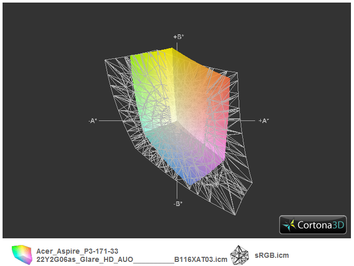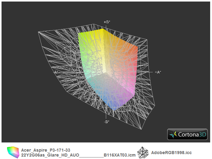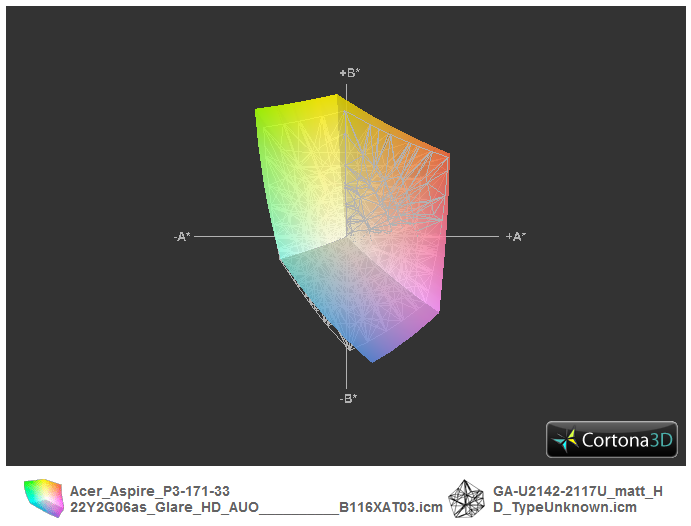Professionellen Ansprüchen wird das Panel nicht gerecht, zumindest nicht, wenn die Standard-Räume sRGB und AdobeRGB herangezogen werden. Beides kann die Anzeige bei weitem nicht abdecken. Dies ist aber auch bei den meisten Konkurrenten der Fall, gleich ob IPS- oder TN-Anzeige (Gigabyte U2142 TN-TFT). Das Iconia W700 hat fast denselben, kleinen Farbraum.