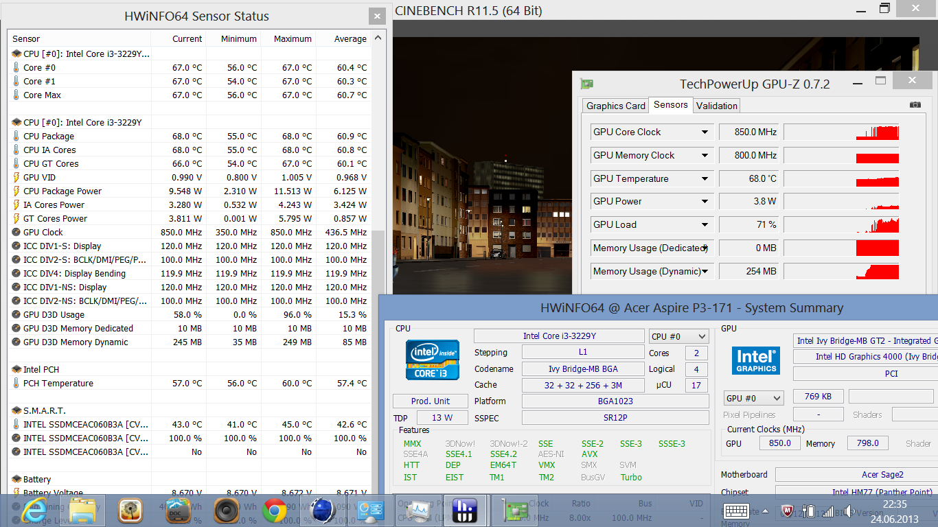 Die HD 4000 des Core i3 arbeitet im Turbo mit bis zu 850 MHz, genau das bestätigt der GPU-Stresstest Furmark. Durch den geringeren Takt und die Single-Channel-Speicheranbindung liegen die Messwerte 27 (W700, Dual Channel) bis 85 % (Dell XPS 13, Dual Channel) unter den Vergleichsgeräten. Selbst Acers Aspire V5-122P schafft mit seiner Radeon HD 8250 nicht wesentlich mehr Punkte im Cinebench R11.5 OpenGL-Test. Die 3D-Benchmarks zeigen in etwa dasselbe Bild: HD-4000-Systeme mit höherem Turbo sowie Dual-Channel erlangen 70 bis 100 % mehr Punkte.