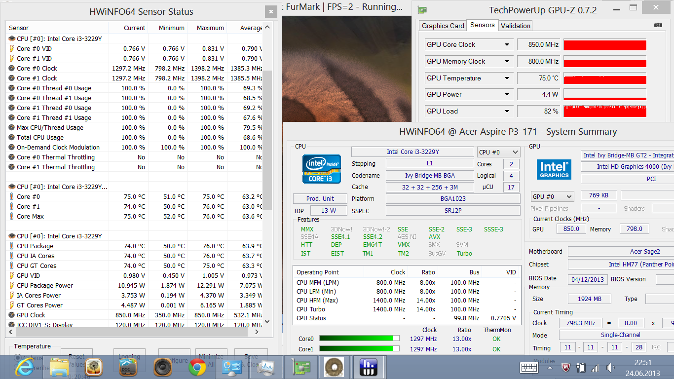 Bei konstant hoher Last für CPU- und GPU-Kerne arbeitet die HD 4000 durchweg mit ihren 850 MHz, wohingegen die CPU auf 1,3 GHz leicht zurückschraubt. Sobald Furmark beendet wurde erhöht sich der Takt wieder auf den Normaltakt (1,4 GHz). Einen Turbo besitzt der Prozessor nicht.