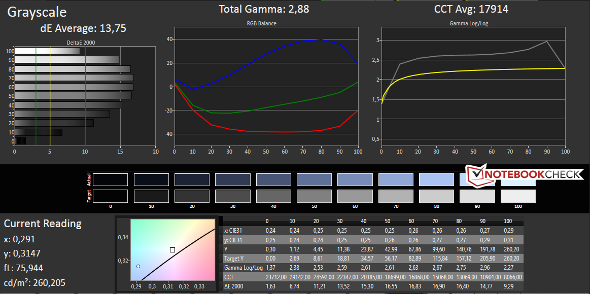 Schon ohne den Blick auf eine genaue CalMAN-Analyse stellen wir einen starken Blaustich fest. Die Abweichungen der Graustufen liegt bei einem deltaE-Wert von 13,75. Ebenso die Farben kommen mit einer durchschnittlichen Abweichung von 12,64 nicht besser weg. Zum Vergleich liegt die Abweichung durchschnittlicher Displays zwischen 5 und 10. Der professionelle Einsatz ist auch wegen der geringen Farbraumabdeckung verwehrt. Im AdobeRGB-Raum beträgt dieser 36 % und im sRGB-Raum 57 %.