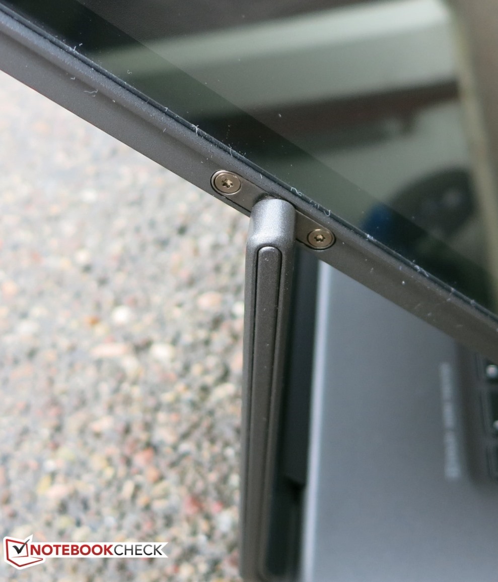 Einzig beim Displayrahmen und den zwei Haltestreben des Bildschirms scheinen Teile komplett aus Metall verarbeitet worden zu sein. Die gesamte Konstruktion ist trotz ihres filigranen Aussehens äußerst stabil. Erreicht wird dies auch dadurch, dass sowohl die Touch Oberfläche an sich als auch die Displayhinterseite laut Acer durch zwei Schichten Corning Gorilla Glass 3 eingefasst sind. Die Scharniere machen einen haptisch äußerst stabilen Eindruck: sogar bei Touch-Eingaben im normalen Laptop-Modus können sie ein Wippen des Displays wirksam verhindern.