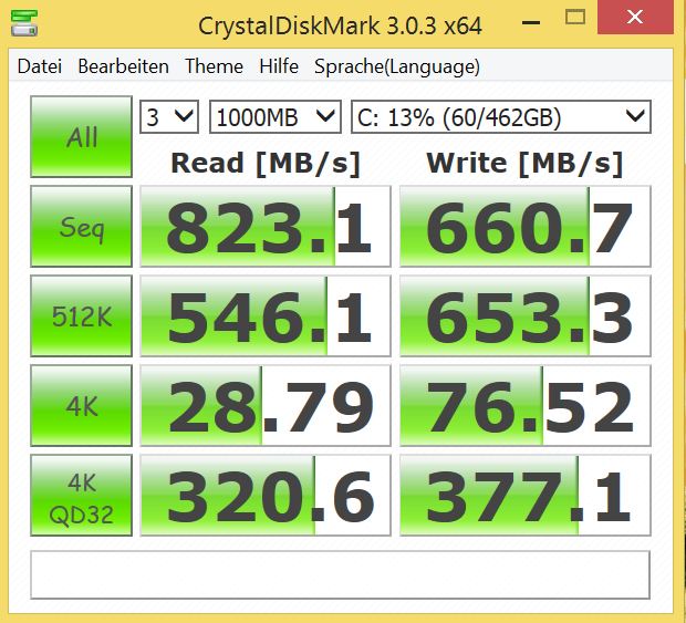 Nichtsdestotrotz steigert das verwendete Verfahren den Datendurchsatz merklich. Wo bei einer einzelnen SSD meist bei etwa 500 MB/s im Schreib- und Lesezugriff Schluss ist, erreicht die SSD-Kombination im Acer R13 sowohl satte 823 MB/s bei sequentiellen Lesezugriffen als auch 660 MB/s im Schreibmodus laut CristalDiskMark-Benchmark.