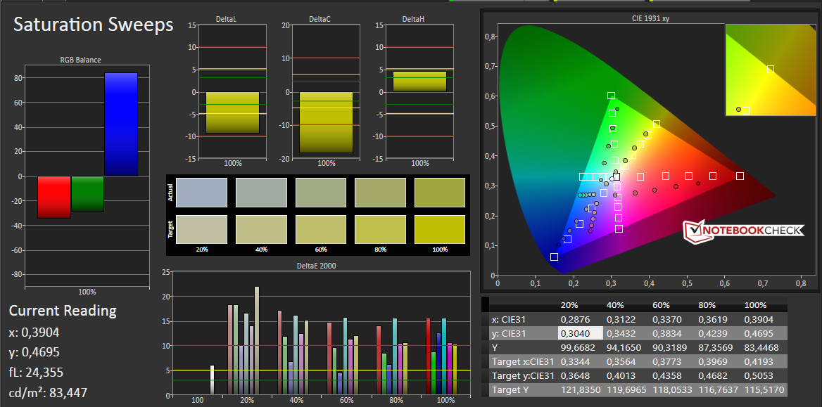 Wir stellen bei unserem Testgerät einen Kontrast von 625:1 und einen Schwarzwert von 0,36 cd/m² fest. Subjektiv betrachtet hinterlässt das Testgerät hier einen passablen Eindruck. Dennoch, ein satteres Schwarz und einen erkennbar höheren Kontrast treffen wir bei den Vergleichskandidaten an. Außerdem fallen die DeltaE-Abweichungen vom sRGB-Farbraum bei Farben und Graustufen (über 12) sehr hoch aus. Das führt unter anderem zu einem starken und sichtbaren Blaustich.