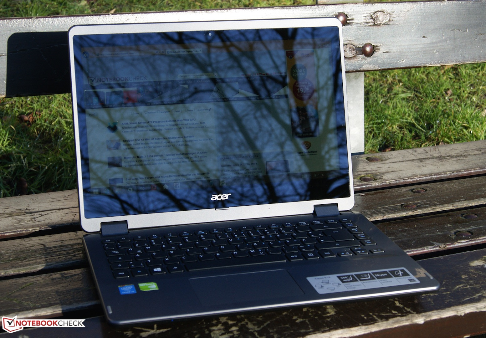 Acer verwendet für eine optisch gepimpte Bilddarstellung ein spiegelndes Display. Leider zieht diese Wahl im Außengebrauch Konsequenzen mit sich: Nur unter besonders schattigen Begebenheiten kann das Testgerät hier verwendet werden. Bei der Konkurrenz sieht es allerdings weitestgehend nicht anders aus, da auch diese auf ein spiegelndes Display setzen. Sollte dennoch der Einsatz im Outdoor-Bereich unabdingbar sein, ist das Dell dank seiner hohen Helligkeit wohl die bessere Wahl. Weiterhin fällt bei seitlicher Betrachtung der Abstand bzw. die verschobene Darstellung zwischen Touch-Oberfläche und dem Displaypanel selbst unangenehm auf.