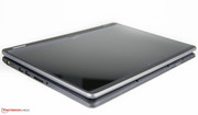 Die TN-Panel-Technologie schließt eine ordentliche Blickwinkelstabilität bauartbedingt aus. Besonders bei Kippbewegungen werden Farben und Helligkeiten bis zur Unkenntlichkeit verfälscht. Besonders störend wird es im "Tent"-Modus. Für ein Convertible, das mit zahlreichen Bedienungsmodi punkten will, ist das hier anzutreffende Display eindeutig die falsche Wahl.