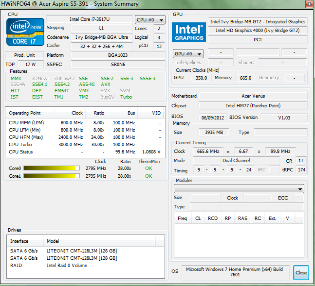 Vergessen wir das enttäuschende Display und wenden uns dem Herz des Aspire zu: Dieses schlägt mit 1,9 GHz (Turbo bis 3,0 GHz) und entstammt, wie bei allen aktuellen Ultrabooks, Intels Ivy-Bridge-Generation. Der Core i7-3517U ist der momentan zweitschnellste ULV-Prozessor überhaupt, die sich durch eine TDP von nur 17 Watt von den regulären Dual-Core-Modellen unterscheiden. Neben der bereits seit einigen Jahren bekannten Hyper-Threading-Technologie verfügt die CPU über eine Reihe weiterer moderner Features, die Sie im Detail in unserer Datenbank nachlesen können.