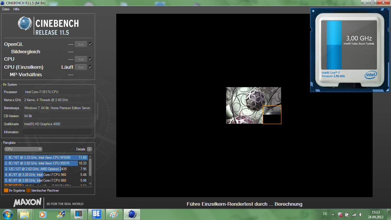 Wir wollen zunächst einen Blick auf Single-Thread-Benchmarks wie den entsprechenden Test des Cinebench R10 (64 Bit) werfen, wo der Core i7-3517U dank starkem Turbo-Boost bis 3,0 GHz mit exzellenten Ergebnissen glänzen kann. 5052 Punkte liegen auf einem Level mit der beliebten 35-Watt-CPU i5-3210M - überaus beachtlich für ein Stromsparmodell. Gegenüber dem günstigeren i5-3317U geht der i7 damit rund 15 Prozent in Führung.