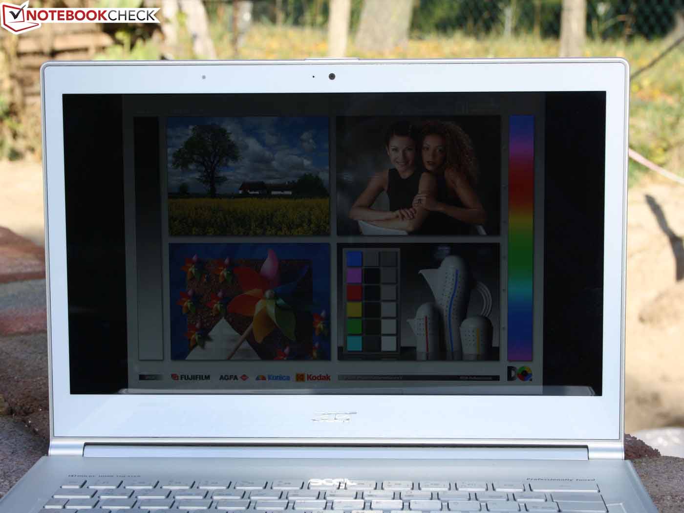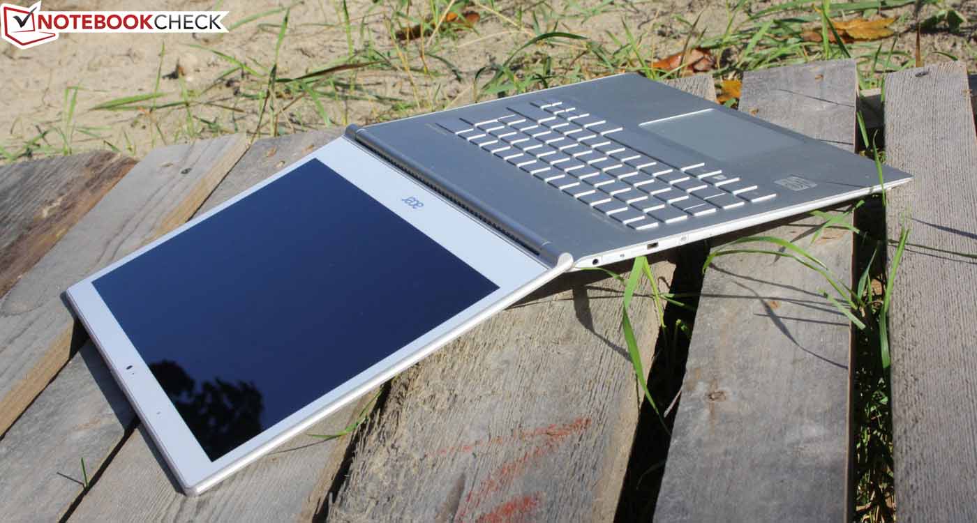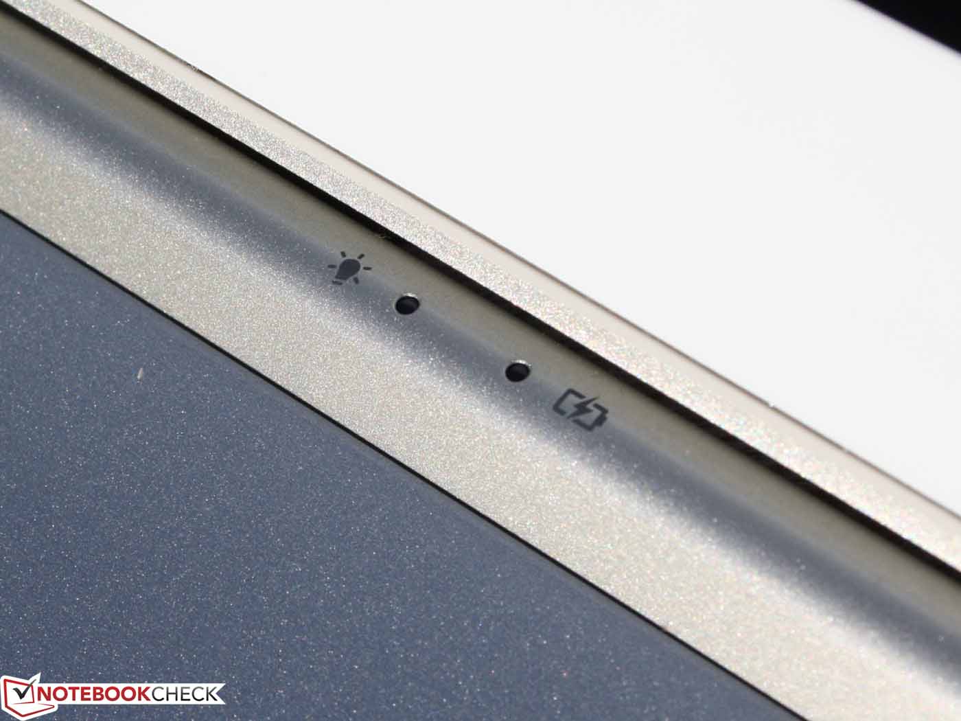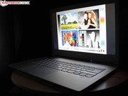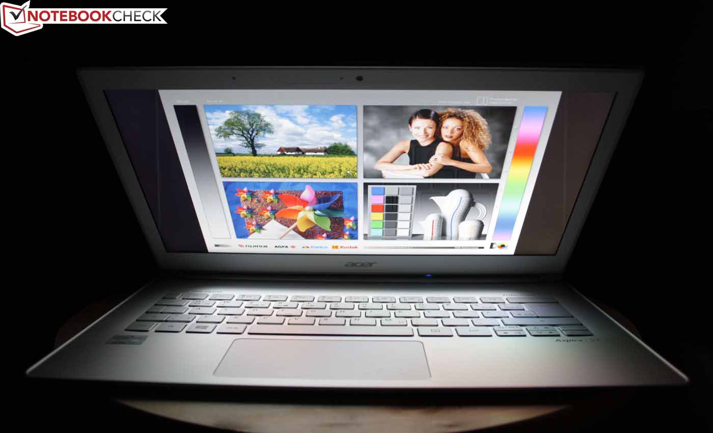Der Helligkeitssensor am oberen TFT-Rahmen irritiert unsere Messung nicht, denn auch bei greller Lichteinwirkung bleibt das Ergebnis dasselbe. Am Netz können wir gut beobachten, wie der Sensor für eine adaptive Steuerung der Panel-Ausleuchtung sowie der Tasten-Beleuchtung sorgt. Im Bezug auf die Outdoor-Tauglichkeit der Anzeige sind Samsung und Asus dem Acer S7 haushoch überlegen (entspiegelt, hohe Helligkeit). Das MacBook spiegelt, ist aber deutlich heller (im Akkubetrieb, sonst nicht).